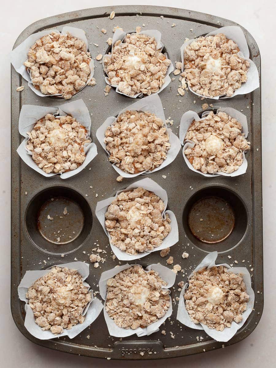- Top each muffin with a generous amount of oat streusel and gently press it onto the batter. Optional: Refrigerate assembled muffins up to 12 hours before baking.