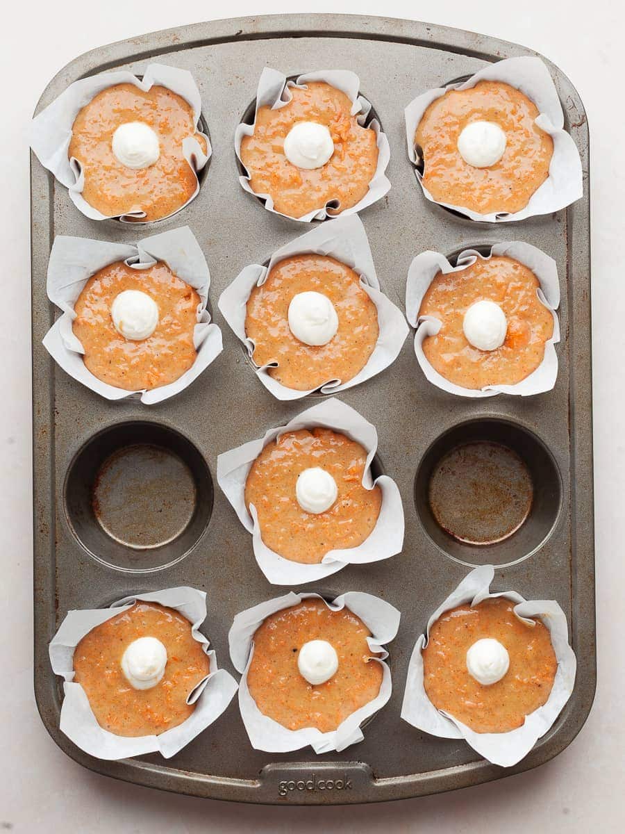 - Step 1: Using a large cookie scoop (like this #20 scoop), evenly divide the gluten free carrot muffin batter between the muffin liners, filling each one all the way to the rim.