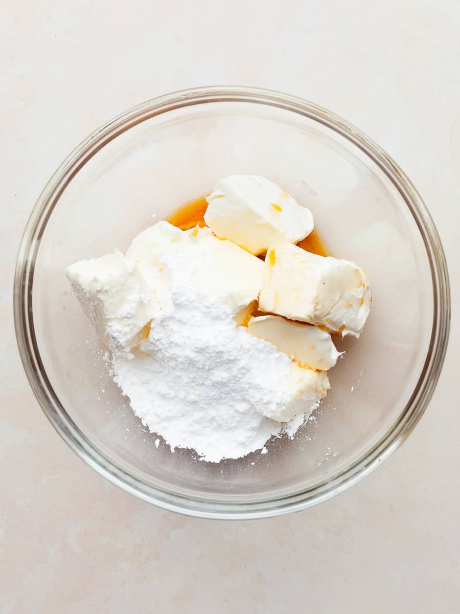 - Step 1: To make the cream cheese filling, combine the room temperature cream cheese, powdered sugar, salt, and a generous teaspoon of vanilla extract in a medium bowl.