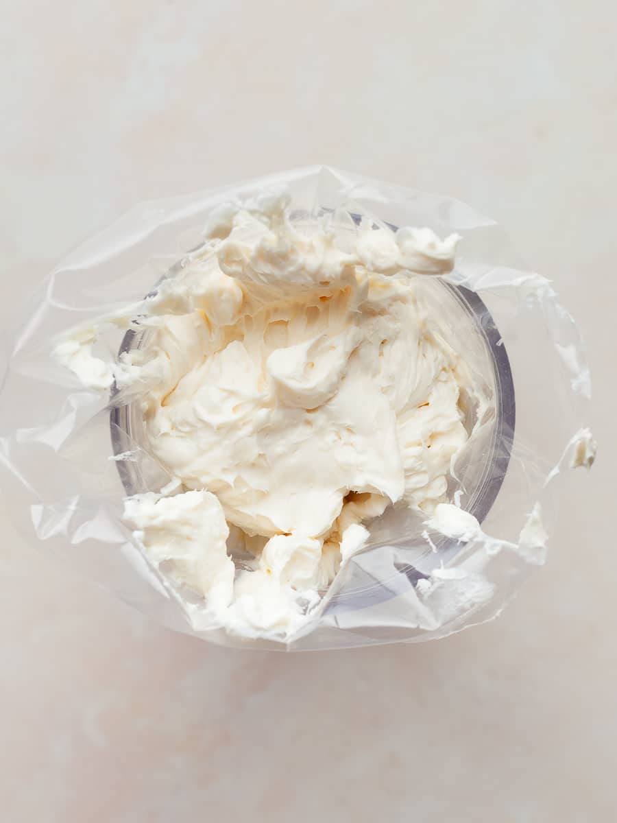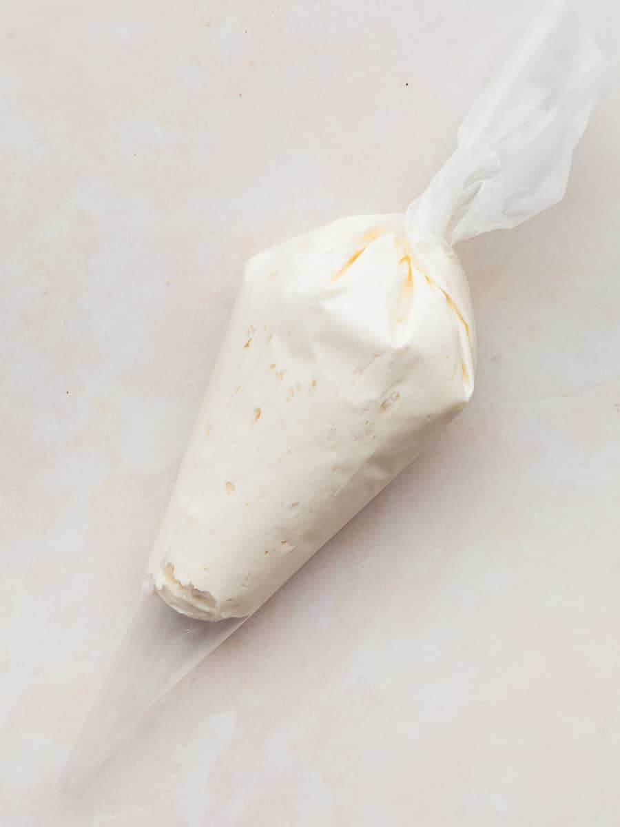 - Step 3: Transfer the cream cheese filling to a piping bag or zip-top bag. The easiest way is to place the bag tip-down inside a tall glass, fold the top edge over the rim to hold it open, spoon in the filling, then lift the bag out and twist the top closed.