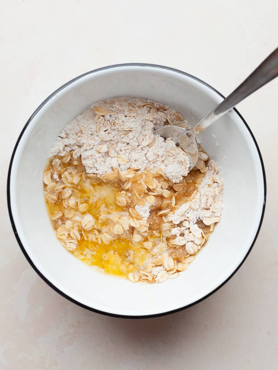 - While the butter is cooling, combine gluten free flour, light brown sugar, rolled oats, cinnamon, and kosher salt in a mixing bowl. Whisk these ingredients together.