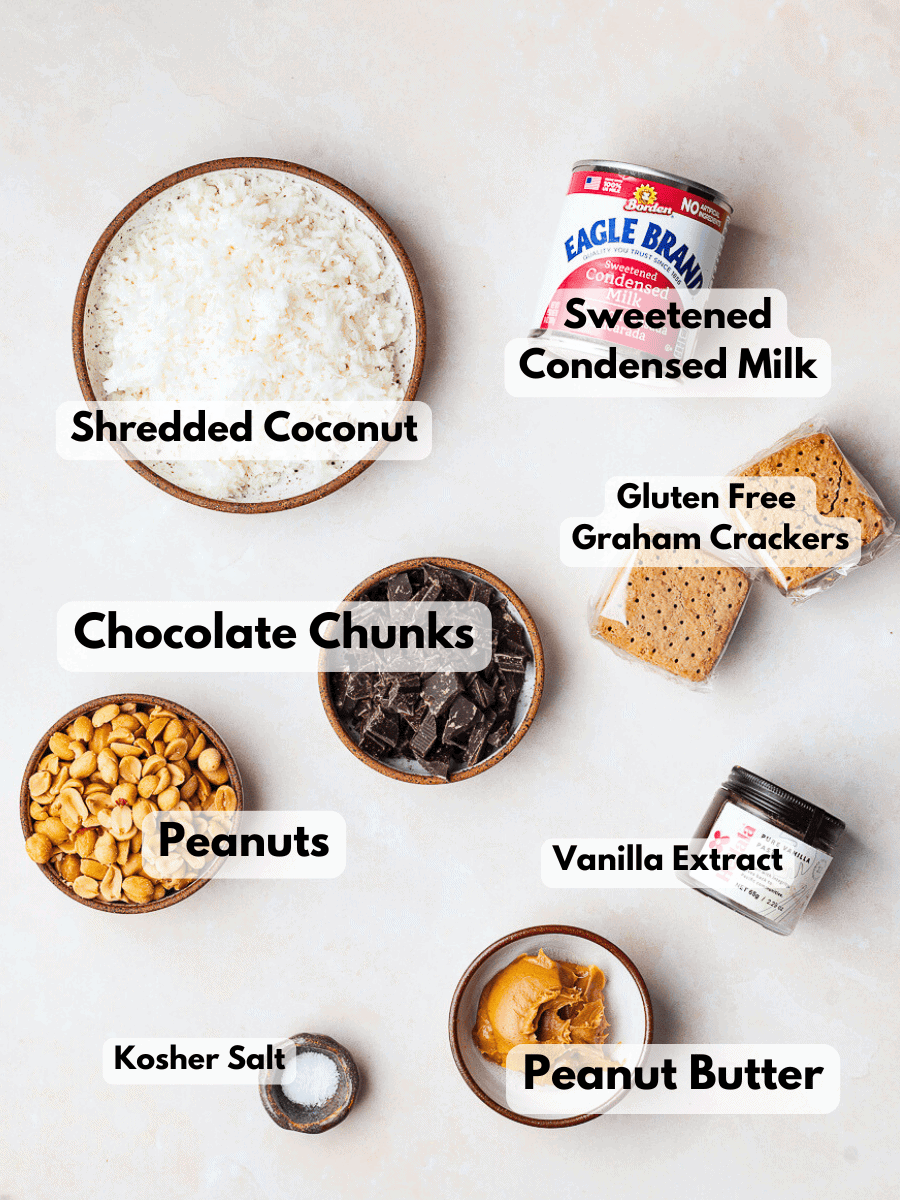 - Step 2: In the meantime, combine the sweetened coconut, crushed graham crackers (I like to crush them in a zip-top bag with a rolling pin, though clean hands work just as well), roasted peanuts (or your choice of nuts), kosher salt, and chopped dark chocolate in a large bowl. Stir until evenily combined.