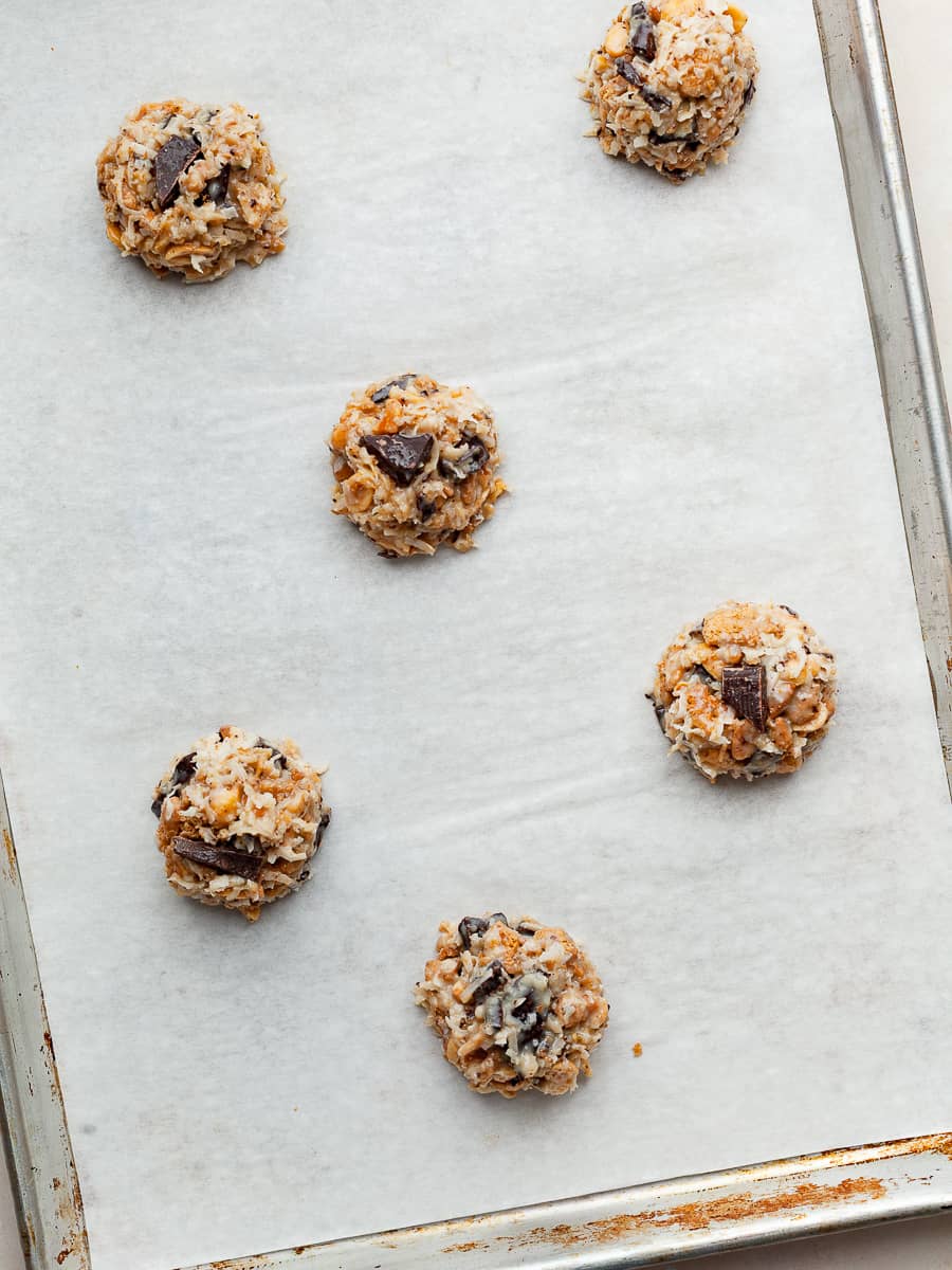- Preheat the oven to 350°F and line two baking sheets with parchment paper. Using a large cookie scoop (or two spoons), divide the dough into mounds on the sheets. The dough will be sticky - that’s normal. You should get about 14 - 16 cookies, or 7 - 8 per tray.