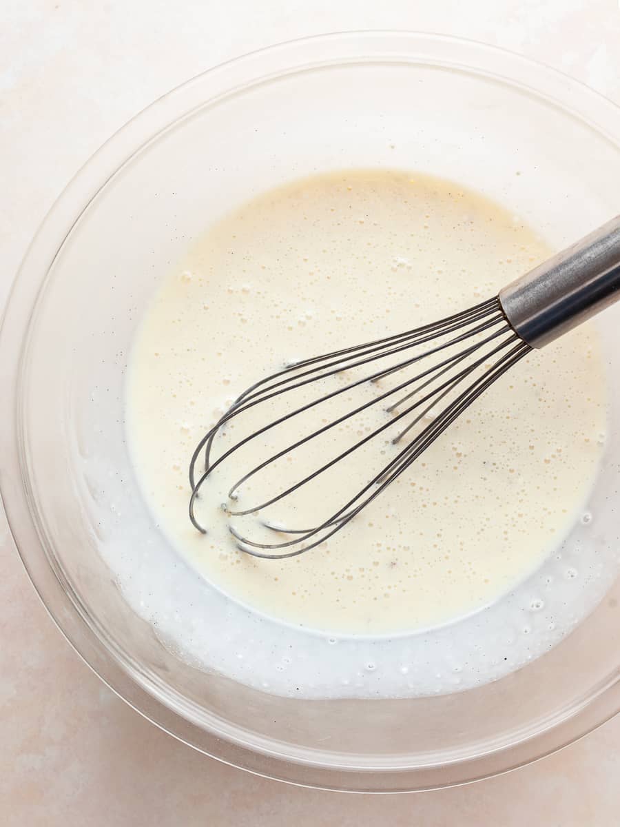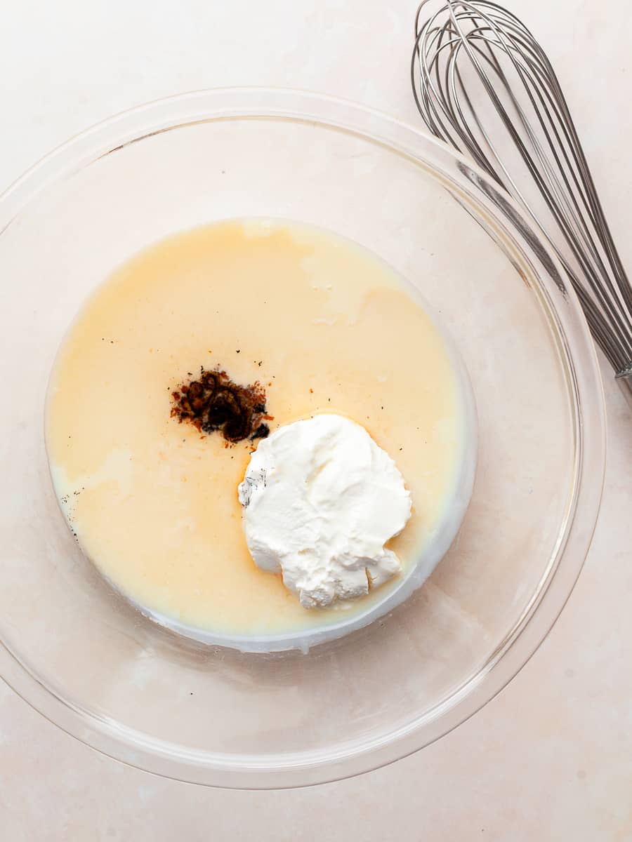 - In a mixing bowl, combine sweetened condensed milk, sour cream, kosher salt, rum (if using), and vanilla extract or vanilla bean paste. If using a vanilla bean, slice it lengthwise, scrape out the seeds, and add them to the bowl.
