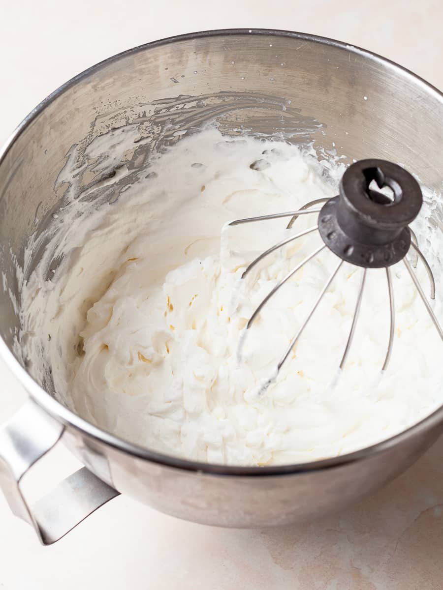 - In a stand mixer fitted with the whisk attachment, whip the cold heavy cream on medium speed until stiff peaks form, about 2–3 minutes.