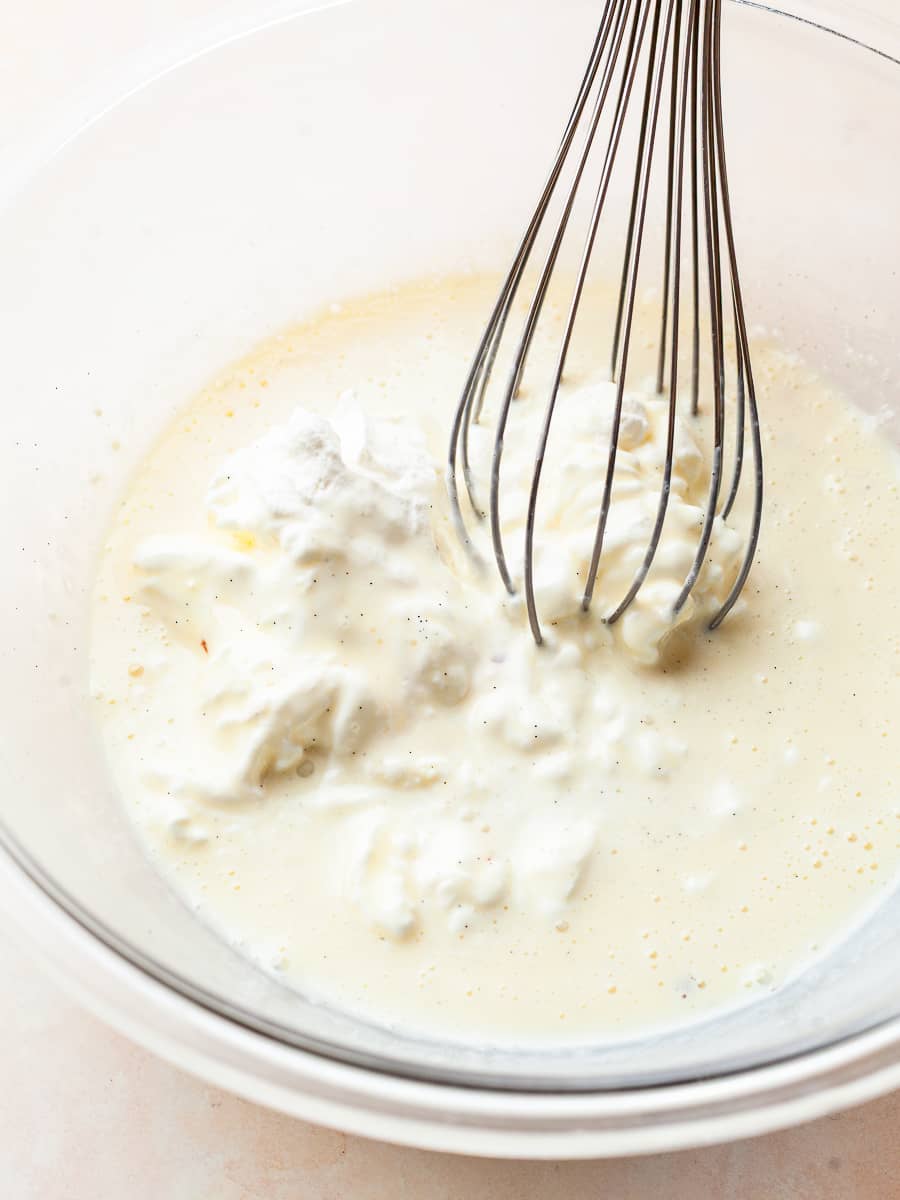 - Step 6: Fold in the whipped cream in thirds, starting with one portion to lighten the base, then gently folding in the rest until smooth, airy, and fully combined. A whisk or flexible rubber spatula works best for this.