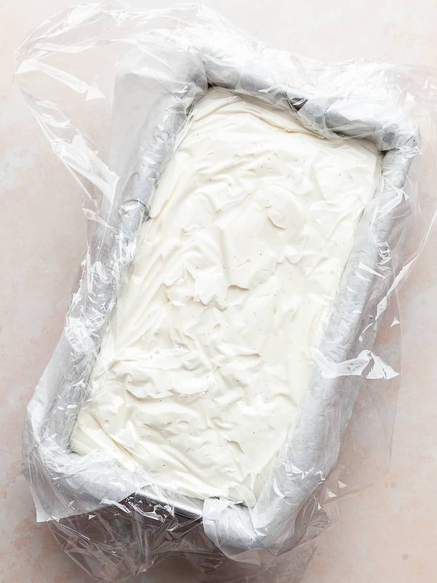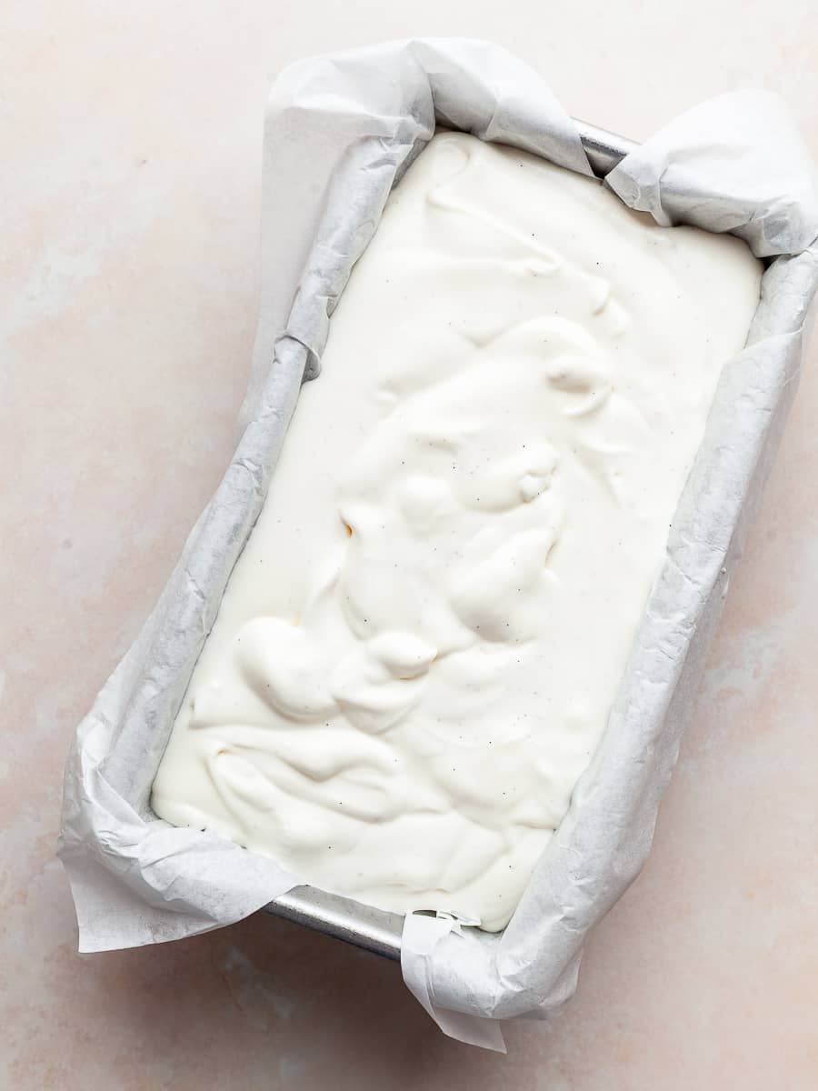 - Step 8: Retrieve the prepared loaf pan from the freezer and transfer the no churn ice cream to it.