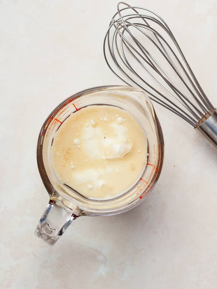 - In a small bowl, whisk together milk, room-temperature egg, sour cream, vanilla extract, and oil until smooth.