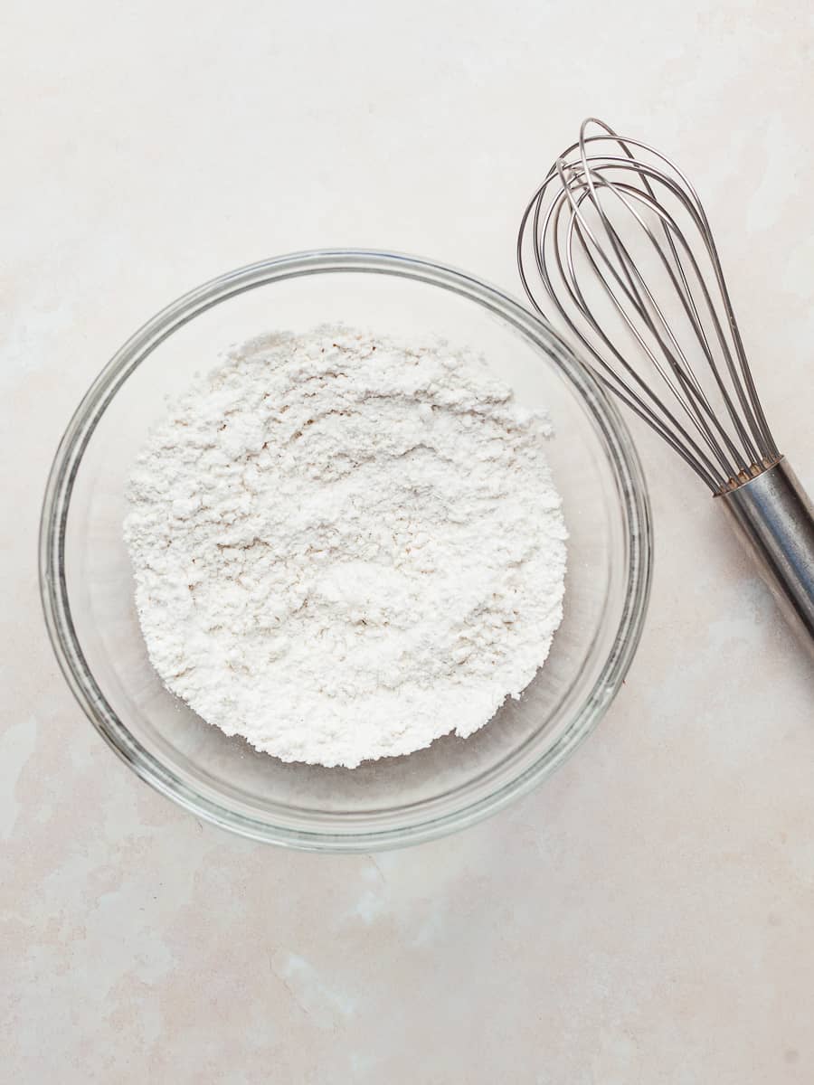 - In a separate bowl, combine gluten free flour, sugar, baking powder, and kosher salt. Whisk to combine.