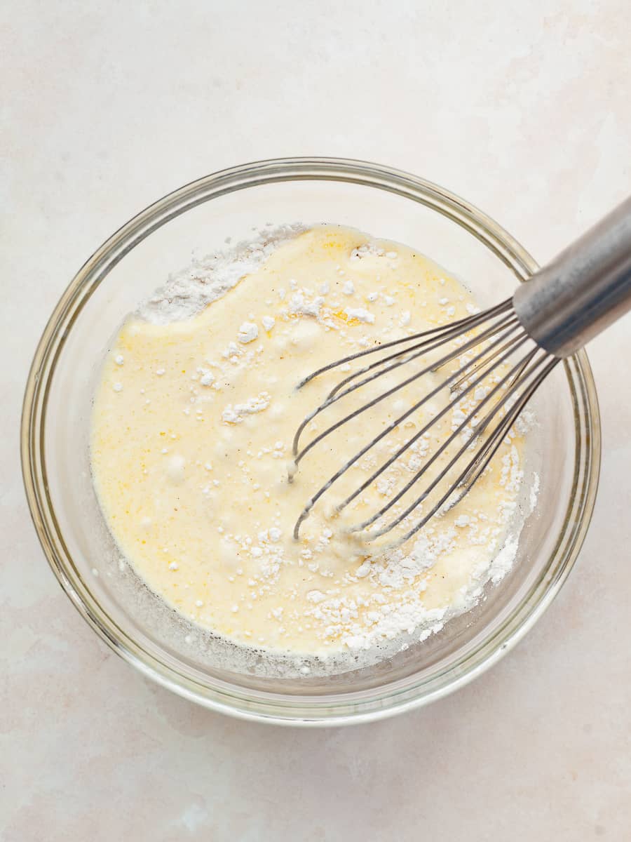 - Add wet ingredients to dry ingredients and whisk until smooth. Let batter rest 5–10 minutes.