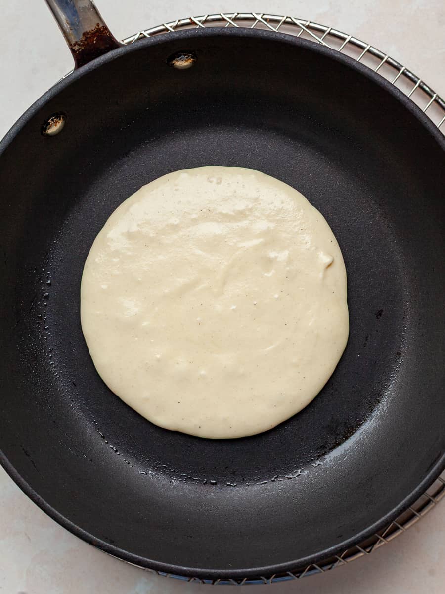- Reduce heat to low. Using a large cookie scoop, ladle, or measuring cup, pour about ⅓ to ½ of the batter into the pan. Pancakes don’t need to be perfectly round.