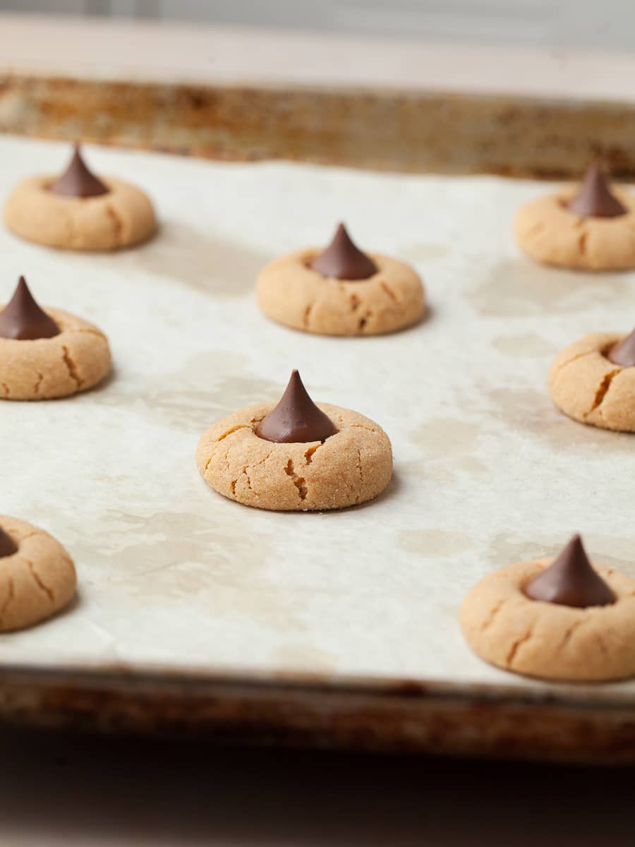 Using a small cookie scoop (about 1 tablespoon of dough), you’ll get around 32-36 peanut butter kiss cookies - depending, of course, on how much dough “disappeared” before baking.