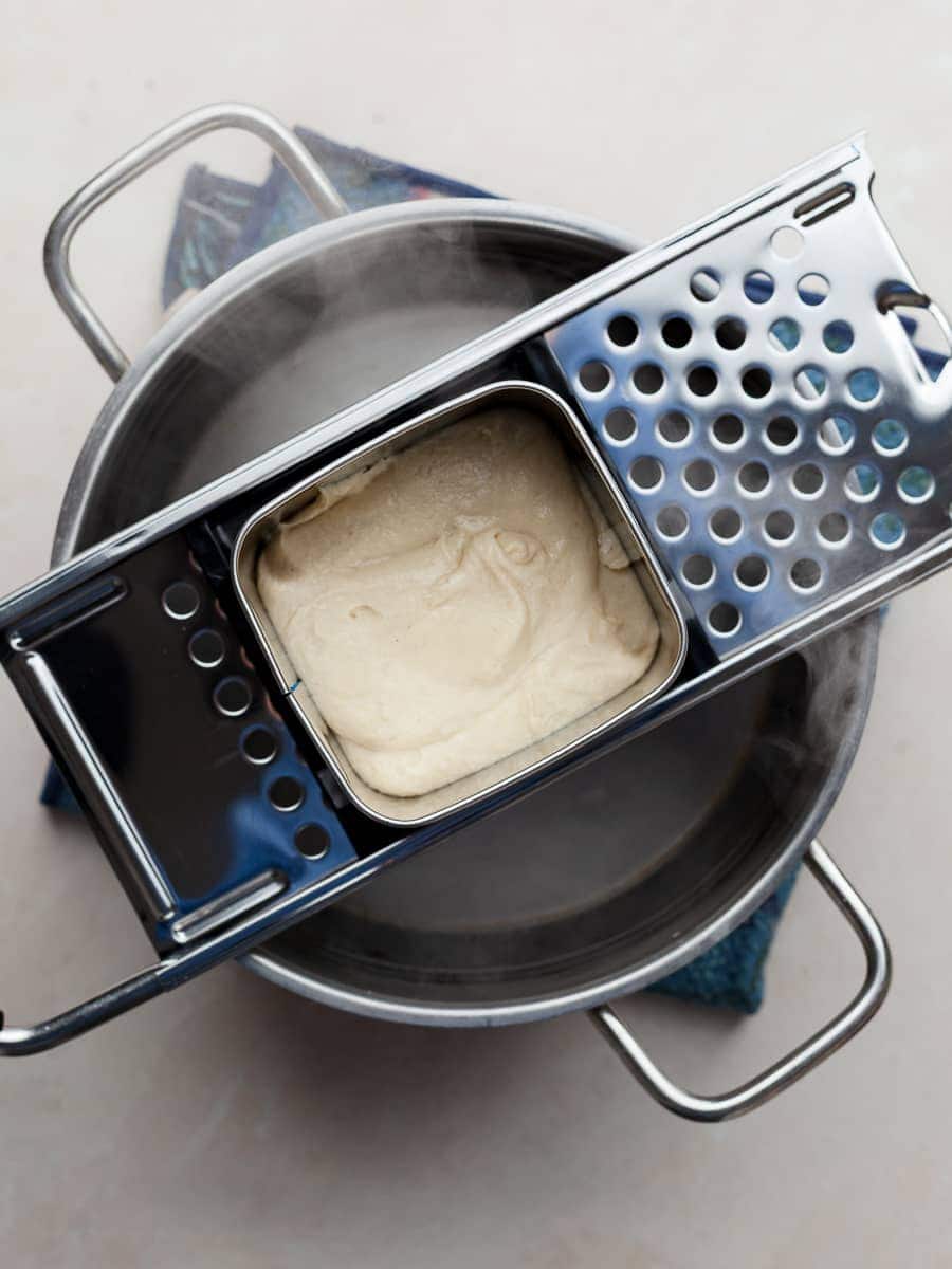 - Place your spätzlehobel (or other tool) over the boiling water. Follow your tool’s instructions if it differs.