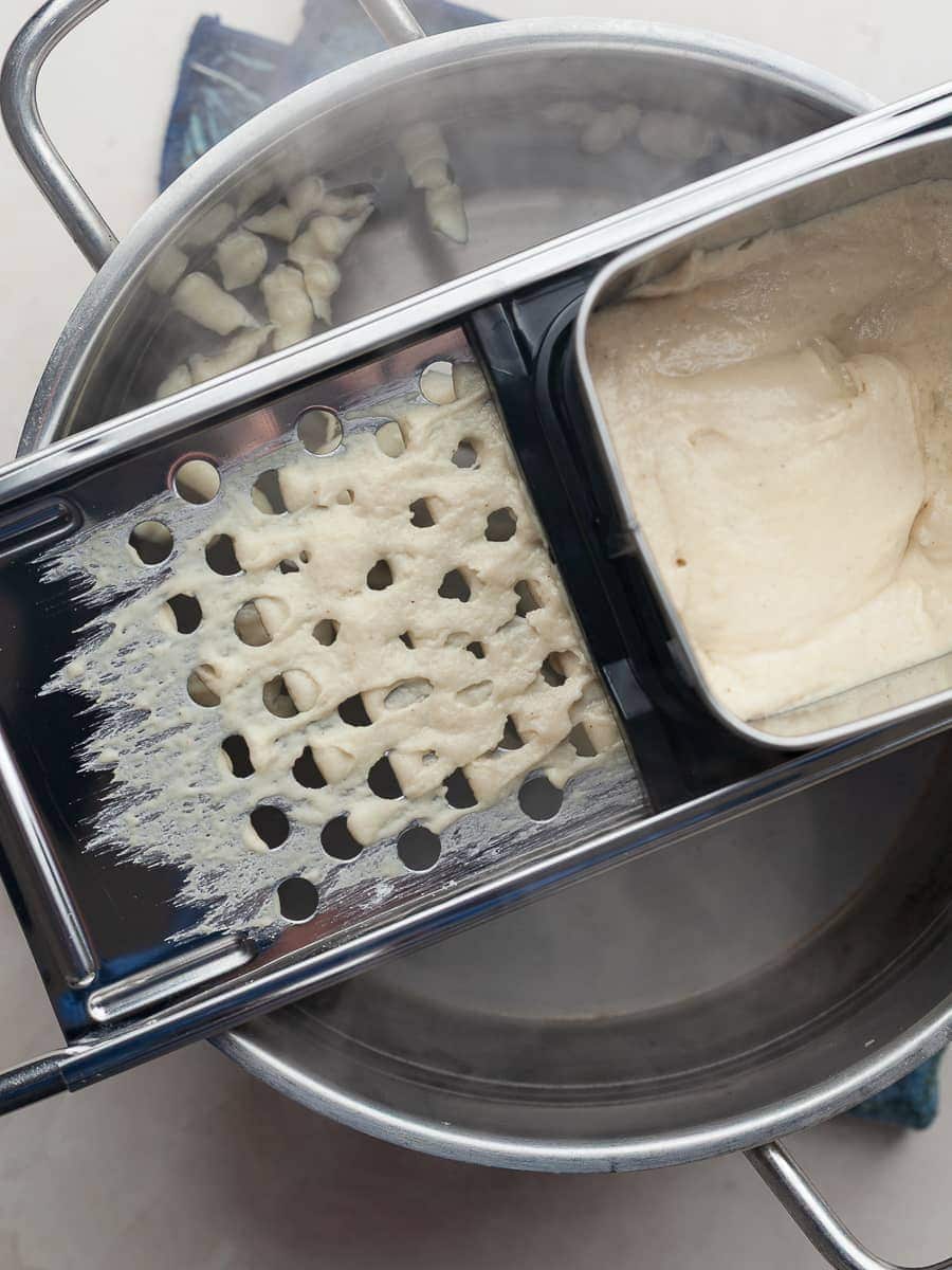 - Step 4: Push the hopper briskly back and forth over the holes. The dough will press through and drop into the boiling water in little irregular noodles — exactly what you want.